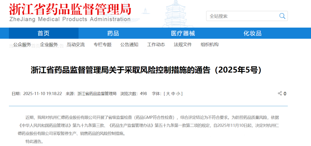 近日,浙江药监局发布公告,宣布对杭州仁德药业股份有限公司采取暂停生产、销售药品的风险控制措施。